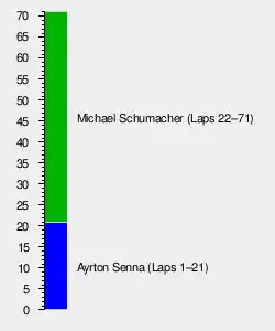 At the start Senna led from pole position, while Alesi overtook Schumacher. Schumacher retook second place on lap 2 and started chasing after Senna, who had pulled a 4-second lead in the opening laps. Before the pit stops Schumacher had reduced the gap to just over a second, and on lap 21 the leading pair entered the pit lane together. Despite both teams running the same fuel strategy, Schumacher's stop was faster than Senna's, and thus he took the lead.