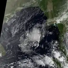 A low pressure area formed over the western Bay of Bengal on October 28. On the next day, the IMD classified it as a depression, and soon upgraded it to a deep depression. On October 30, the IMD upgraded it further to a cyclonic storm and later a severe cyclonic storm, estimating peak 3–minute winds of 110 km/h (70 mph); this was based on the appearance of a well-defined eye. Also on October 30, the JTWC initiated advisories on the system as Tropical Cyclone 04B north of Sri Lanka. The storm consisted of a consolidating area of thunderstorms, with spiral rainbands. Steered by a ridge to the north, the system moved west-northwestward toward the southeast coast of India. Early on October 31, the storm made landfall in southeastern India near Chennai with winds of 110 km/h (70 mph), according to the IMD, and 85 km/h (50 mph) according to the JTWC. Late on October 31, the storm fell below depression status after weakening over land.[2][1]