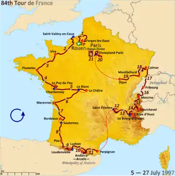 ![]() Route of the 1997 Tour de France | |||||||||||||||||||||||||||||||||||||