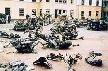 The explosion damaged the embassy building and collapsed the neighboring Ufundi Building where most victims were killed, mainly students and staff of a secretarial college housed here. The heat from the blast was channeled between the buildings towards Haile Selassie Avenue where a packed commuter bus was burned. Windows were shattered in a radius of nearly 1⁄2 mile (800 m). A large number of eye injuries occurred because people in buildings nearby who had heard the first explosion of the hand grenade and the shooting went to their office windows to have a look when the main blast occurred and shattered the windows.[26][27]