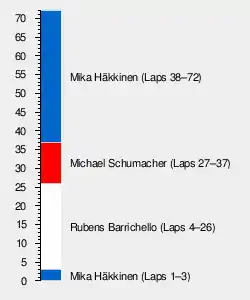 Michael Schumacher came in for a pit stop on lap 38, allowing Mika Häkkinen past. Häkkinen had been held up by Schumacher, so he began trying to build up enough of a gap so he could come out ahead of Schumacher after his own pit stop. Lap traffic delayed his progress at first, but after one lap he was able to turn in a couple of fast laps. He pitted on lap 42, and his fast laps combined with quick work by his pit crew allowed him to easily retain the lead over Schumacher.[4]