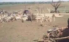 At 6:23 p.m. CDT, a ninth tornado associated with supercell "A" touched down about two miles (3.2 km) south-southwest of Amber.[16] The tornado quickly intensified in both strength and size as it crossed Oklahoma State Highway 92, attaining F4 strength about 4 miles (6.4 km) east-northeast of Amber. It quickly became a wedge tornado, varying between one-quarter and one mile (0.40 and 1.61 km) in width at various points throughout the track. Damage consistent with this rating was sustained over the following 6.5 miles (10.5 km) of the path before striking Bridge Creek. There, it attained the highest-possible rating on the Fujita Scale, F5. A mobile Doppler weather radar recorded winds of 301 mph (484 km/h) within the tornado at Bridge Creek, the highest wind speed ever recorded on Earth.[19] Since the record for maximum winds are reported from only non-tornadic events, however, the 253 mph (407 km/h) wind gust from Cyclone Olivia in 1996 retained the title.[20][21]