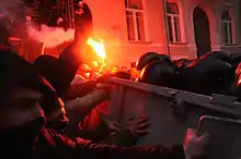On the night of 30 November 2013 at 04:00, armed with batons, stun grenades, and tear gas, Berkut special police units attacked and dispersed all protesters from Maidan Nezalezhnosti while suppressing mobile phone communications.[1] The police attacked not only the protesters (most of whom didn't or failed to put up resistance) but also other civilians in the vicinity of Maidan Nezalezhnosti, when the Berkut forces chased unarmed people several hundreds of meters and continued to beat them with batons and feet.[2] Initially, 35 people were injured as a result of the militia raid, including a Reuters cameraman and a photographer.[3][4] Other protesters were detained.[1] Most of the protesters were students.[4] At 09:20 Berkut besieged the St. Michael's Golden-Domed Monastery where approximately 50 Euromaidan activists, including the injured, found sanctuary.[1][5] Police spokeswoman Olha Bilyk justified the police raid by saying that protesters were interfering with preparations to decorate the square for the Christmas and New Year's holidays, and accused them of throwing stones and burning logs.[6] Minister of Internal Affairs Vitaliy Zakharchenko later apologized and claimed "riot police abused their power" and promised a thorough investigation.[7] Via state television he added "if there are calls for mass disturbances, then we will react to this harshly".[7]