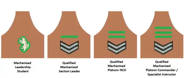 - Students that qualified as Platoon NCOs were authorised to wear two parallel green bars. The Platoon NCOs were responsible for the support of the vehicles, platoon weapons and signal equipment of a specific platoon.
