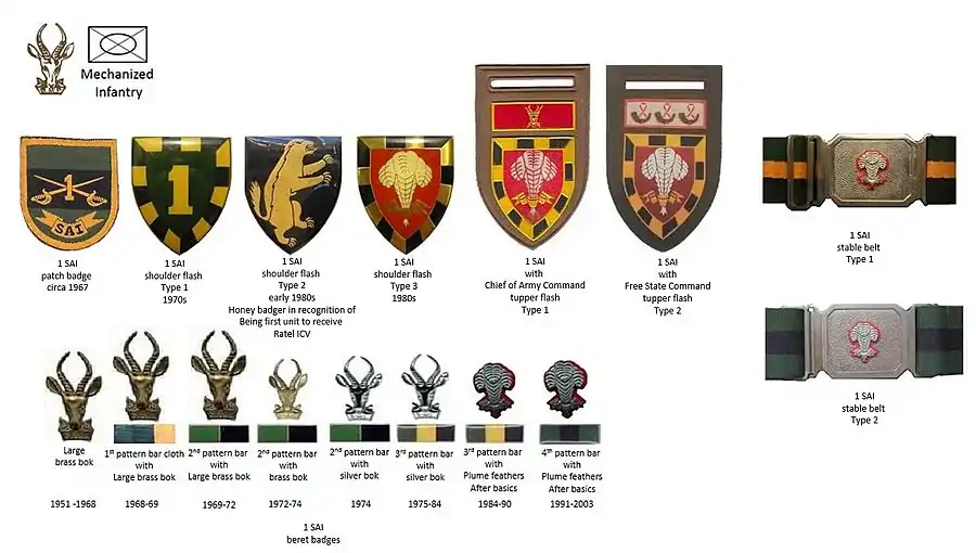 In 1977, 1 SAI received its first consignment of 42 Ratel IFVs. The shoulder flash of 1 SAI was redesigned depicting a rampant honey badger, while the first mechanised infantry junior leadership training courses started.