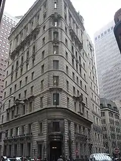 The 11-story structure, clad in limestone with a steel frame, is located at the southern corner of the five-pointed intersection of William, South William, and Beaver Streets. It occupies a quadrilateral lot, with an acute angle between South William Street to the west and William Street to the east. In 1996, the building was designated as a landmark by the New York City Landmarks Preservation Commission.[2] In 2007, the building was designated as a contributing property to the Wall Street Historic District,[3] a National Register of Historic Places district.[4]