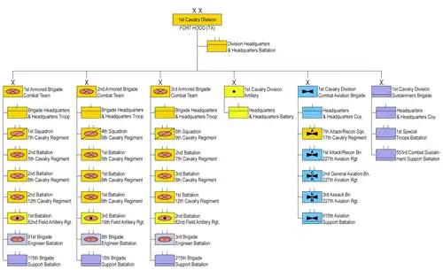 The 1st Cavalry Division ("First Team")[1] is a combined arms division and is one of the most decorated combat divisions of the United States Army.[2] It is based at Fort Hood, Texas. It was formed in 1921 and served during World War II, the Korean War, the Vietnam War, the Persian Gulf War, with the Stabilization Force in Bosnia-Herzegovina, in the Iraq War, in the War in Afghanistan and in Operation Freedom's Sentinel. As of October 2017, the 1st Cavalry Division is subordinate to III Corps and is commanded by Major General Jeffery D. Broadwater.