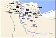 By the 23rd, 5th Brigade had joined up with 7 Armoured Div, deploying straight from its advance into the centre of the armoured division area of deployment to the south of the airfield. The 1st SA Brigade was expected later the morning, from its night march from El Gubi.[39] Unbeknownst to the division – Rommel's plan was to attack 7 Armoured Division in a frontal assault with the Afrikakorps and to launch an attack into the rear of 7th Armoured Division with the armoured Ariette Division. The 5th SA Brigade was caught in the middle of this armoured attack.[40]