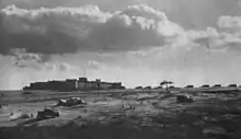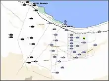 Although it had been agreed that Tobruk would no longer be "held at all costs" in the event of an Axis attack, it formed a critical forward base to protect the Gazala Line from air, land or sea attack.[62] Auchinleck recommended to Ritchie that the forthcoming battle was to be fought west of Tobruk, and not on the frontier. For this reason, 2nd Brigade was also moved forward to support the 1st.[62] By 10 February, the Gazala defences were organised on a two division basis, with the left (southern) sector occupied by the 4th Indian Division and the 1st SA Division taking responsibility for the right sector, reaching down to the sea.[63] On 10 March, Brink injured his back and was evacuated back to South Africa – he was replaced by Dan Pienaar from the 1st Brigade, who had now been promoted to Maj-General.[64]