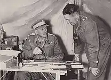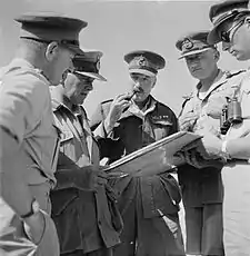 Deployed at Matruh and responsible for constructing defensive positions, the division was still not considered ready for operations by the end of June – having 90% of its allotted transport (many vehicles being those which had been used in the East Africa campaign) and 90% of its arms and equipment.[26] Severe administrative problems, as well as organizational issues related to integration of the division into the Western Desert Force, caused discontent and eventually lead Gen. Brink to raise the issues with Field-Marshal Smuts and the Chief of SA General Staff when they visited Cairo in early July.[27] Discussions indicated that Lt-Gen. Sir Alan Cunningham and Wavell were of the opinion that South Africa could not field two divisions[nb 5] for lack of resources. Smuts claimed that the manpower shortages were due to troops being retained for protection duties in East Africa and that a lack of shipping precluded the arrival of a further 3,000 men and he rejected the idea of reducing the South African forces into divisions of two brigade strength, as was recommended by Wavell.[28] In addition, Brink continued to express his displeasure at the fact that the 1st Division was being utilised to construct defensive positions, instead of training in order to prepare for operations.