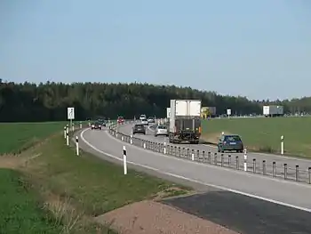 The first 2+1 road in Finland was opened in 1991 on Finnish national road 4 between Järvenpää and Mäntsälä, since then upgraded to a motorway. Since then, numerous 2+1 roads have been built into the national road network. They resemble motorways in that they are typically, although not always limited-access roads and have no at-grade interchanges. In mid-1990s, 2+1 roads with traffic separators were introduced; these are effective in preventing head-on collisions, approaching the safety of motorways.[3] In 2006, there were 440 km of 2+1 roads, [4] e.g. along road 3 and road 4. However, they weren't that much of a panacea: interchanges made the roads much more expensive than planned and confusing to drivers. Thus, new construction halted and only 2+2 roads with traffic separators were built. These are however more expensive and require more widening of the road.[5]