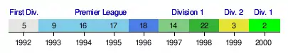 Prior to this season, the history of Manchester City's performance in the English football league hierarchy since the creation of the Premier League in 1992 is summarised by the following timeline chart – which commences with the last season (1991–92) of the old Football League First Division (from which the Premier League was formed).