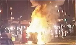 Over the course of the rioting 26 cars were burnt out,[6] two police officers and two journalists were severely injured, and a shop was set alight. Both police officers and members of the public were pelted with bottles and bricks.[3][7]