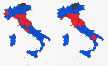 ![]() Election results maps for the Chamber of Deputies (on the left) and for the Senate (on the right). On the left, the color identifies the coalition which received the most votes in each province. On the right, the color identifies the coalition which won the most seats in respect to each Region. Blue denotes the Centre-right coalition, Red the Centre-left coalition and Gray regional parties. | |||||||||||||||||||||||||