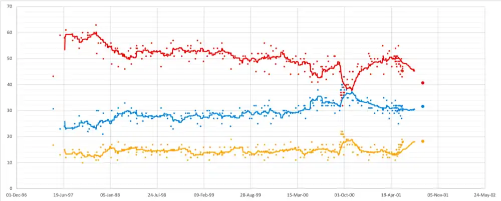 By the end of 2000, however, the dispute had been resolved and Labour were firmly back in the lead of the opinion polls.[5] In total, a mere 29 parliamentary seats changed hands at the 2001 Election.[6]