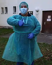 Medical gloves, like masks and gowns, also serve the purpose of preventing contamination of disease by blocking contact between the hands and the various bacteria, fluid, and fomites that carry the disease.[16] HCWs can again, like gowns, easily dispose of and change gloves in order to help improve and maintain good sanitary conditions.[17] Compared to all of the other pieces of equipment, gloves were worn the most often by HCWs who contracted the disease.[9]