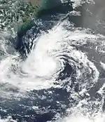 While the storm passed south of Taiwan, it dropped heavy rainfall peaking at 320 mm (13 in) in Pingtung County.[25] Rainfall in Japan peaked at 123 mm (4.8 in) at a station in Kagoshima Prefecture.[26] The threat of the storm prompted school closures and 20 airline flight cancellations.[27] Noguri injured one person, damaged one house, and caused about $4 million (¥504 million JPY) in agricultural damage.[nb 5][28]