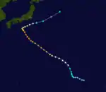While accelerating northeastward, Hagibis developed a well-defined eye and underwent a period of rapid deepening.[23] On May 19, the JMA estimated peak 10-minute winds of 175 km/h (110 mph),[8] and the JTWC estimated 1-minute winds of 260 km/h (160 mph);[9] this made Hagibis a super typhoon, the second of the year. At the time of its peak, the typhoon was located about 305 km (190 mi) west-southwest of the northernmost Northern Marianas Islands.[23] Hagibis only maintained its peak for about 12 hours,[8] after which the eye began weakening.[23] The trough that caused the typhoon's acceleration also caused the storm to lose tropical characteristics, and dry air gradually became entrained in the circulation.[23] On May 21, Hagibis became extratropical to the east of Japan after having weakened below typhoon intensity. The remnants continued to the northeast and dissipated south of the Aleutian Islands on May 22.[8]