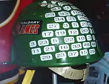 The Calgary Flames' green hard hat on display at the Hockey Hall of Fame.