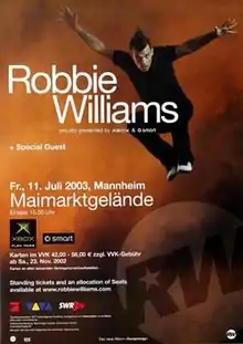 This part of the tour took place in Summer 2003. Williams performed in front of 1.2 million people at 21 shows in Europe. In the United Kingdom, he broke all previous records for ticket sales selling out 375,000 tickets for 3 shows at Knebworth in less than 8 hours.[1] The attendance at these shows set a world record for a run of shows by a single artist. He also performed in Dublin's Phoenix for a crowd of over 120,000. The tour had a massive impact on Robbie's fan base across the continent and boosted sales of the current album Escapology, pushing it into the Top Three in most European countries. The second leg of the European tour was renamed Cock of Justice and took place during Autumn 2003. The final leg of tour in Australia and New Zealand was named Aussie Typo. Additional dates were planned for South America and South Africa but were subsequently cancelled.