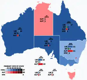 ![]() Popular vote by state and territory with graphs indicating the number of seats won. As this is an IRV election, seat totals are not determined by popular vote by state or territory but instead via results in each electorate. | ||||||||||||||||||||||||||||||||||