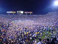 The Hawkeyes then raised their record to 8–2 with victories over Illinois, Purdue, and Minnesota.[1] With a share of the Big Ten championship on the line, the Hawkeyes met Wisconsin in the final regular season game of the year. Iowa won the game,[7] completing its second consecutive unbeaten season at home, and thousands of Hawkeye fans swarmed the field in celebration.[8] Several weeks following the victory, Iowa accepted a bid to play the LSU Tigers in the 2005 Capital One Bowl.[9]