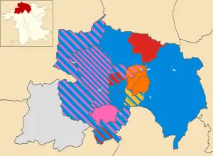 In total 113 candidates stood in the election with all 42 seats being contested for the first time since 1979 after boundary changes had taken place.[3][4] The boundary changes meant that Bewdley ward had gained an extra councillor and become Bewdley and Arley, while Blakedown and Chaddesley had been combined into one ward.[3] The Conservatives put up a full slate of 42 candidates with Health Concern having the next most with 27.[3] Other candidates included 24 Labour, 9 Liberal, 7 Liberal Democrats and 3 independents.[3] A noted feature of the candidates was that there were ten married couples standing in the election with two of them being existing councillors.[5][6]