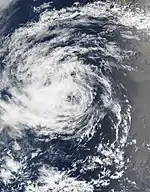 In late July to early August, an organized thunderstorm cluster persisted within the Intertropical Convergence Zone (ITCZ). Upon further development, the disturbance was designated as a tropical depression as it tracked swiftly west, the first and only cyclone to form in the central Pacific throughout the season. Despite initial forecasts of a minimal tropical storm, increasing wind shear and cooler ocean temperatures prompted the depression to instead dissipate by 00:00 UTC on August 5, having only attained peak winds of 30 mph (45 km/h).[24]