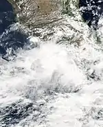 In mid-September, a series of tropical waves entered the eastern Pacific from the Caribbean Sea. One of these waves led to the formation of a tropical depression by 12:00 UTC on September 17, which intensified into Tropical Storm Lidia and attained peak winds of 40 mph (65 km/h) six hours later.[41] Initial forecasts were of low confidence, with forecasters citing uncertainty in whether Lidia or a developing disturbance to its east would become the dominant cyclone.[42] Nearly stationary, the cyclone's cloud pattern soon became distorted by the much larger circulation of developing Tropical Storm Max. Lidia weakened to a tropical depression late on September 18 and was completely absorbed by Max twelve hours later.[41]