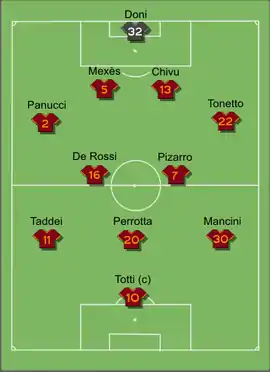 | 20:45 CEST (UTC+02:00) | Aquilani Taddei Totti De Rossi Pizarro |