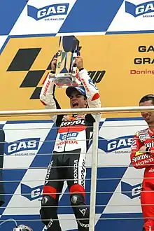 Dani Pedrosa, lifting his trophy on the podium after winning the MotoGP race.