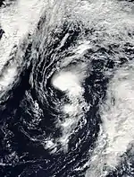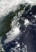 A cold front that moved off the southeastern coast of the United States on September 1 developed a weak low over the waters near Georgia. The low drifted eastward and weakened over the next few days until it joined with convection from an upper-level trough that had been moving over the western Atlantic.[40] On September 8, the center of circulation became sufficiently organized to be declared Subtropical Storm Gabrielle, about 360 nautical miles (670 km) southeast of Cape Hatteras.[41] For the next twelve hours, the system's strongest winds and thunderstorms remained separated from the center. On September 8 new convection eventually united with the center, leading the transition of Gabrielle into a tropical storm. Gabrielle gradually strengthened as it traveled northwest towards North Carolina and Virginia. The storm reached its peak intensity of 60 mph (95 km/h) just before it arrived in Cape Lookout, though strong wind shear kept most of the convection and surface winds offshore.[40] Gabrielle weakened over land, and moved back into the Atlantic on September 10. The circulation deteriorated further, and the storm dissipated southwest of Nova Scotia the next day.[42]