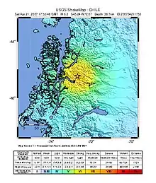 The 2007 Aysén Fjord earthquakes occurred in Aisén Fjord, Chile from January 22 – April 22. The biggest occurred at 1:53 p.m. (local time) on April 21 and reached a felt intensity of VII (Very strong) on the Mercalli intensity scale.[3] On the moment magnitude scale, the earthquake reached a gradation of 6.2. Ten people disappeared, according to ONEMI (Chile's National emergency office), but three bodies were found on April 22 by the Chilean Navy.
