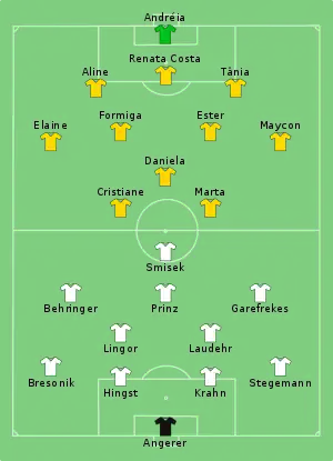 The match was between Germany, who had won the previous Women's World Cup final and Brazil, who had never won a major world title, or indeed even reached the finals of a Women's World Cup. This was the first time in the history of the Women's World Cup that a European and South American had met each other in the final. Germany had not conceded a single goal in the whole competition whereas Brazil were free-scoring. Led by striker Marta, who had scored 7 goals, Brazil had scored seventeen goals in their route to the final, including four against title-rivals United States in the semi-finals. It was considered as "the rematch of the 2002 FIFA World Cup Final", except it was the men's teams.