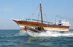 Journalists on Cornwall reported that the British forces had chased and boarded a barge (or dhow) that had offloaded vehicles from the merchant ship. The merchant ship and barges, which had been observed the previous day when a barge was boarded, were suspected of smuggling.[34][35][36][37]