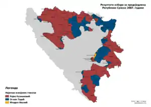 The presidential election of 2007 in the Republika Srpska entity of Bosnia and Herzegovina was announced after the premature death of President Milan Jelić on 30 September 2007 and was held on 9 December 2007.[1] Until the election took place, Igor Radojičić, also from the ruling Alliance of Independent Social Democrats, was acting president.[2] The election had to be called within fifteen days of Jelić's death;[3] it was called on 11 October 2007, with candidates to be nominated by 16 October 2007.[4]