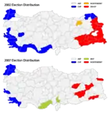 ![]() Winners according to provinces: AKP CHP MHP Independent Thousand Hope Candidates The Thousand Hope Candidates contested the election as independents to bypass the 10% election threshold. Provinces & districts where the total votes for all independents combined topped the poll are shown in purple, even though these candidates may have won fewer votes than other parties individually. | |||||||||||||||||||||||||||||||||||||||||||||||||