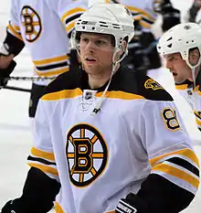 On October 9, the Bruins opened their regular season against the Colorado Avalanche, at the Pepsi Center.[5] The Bruins notched a 5–4 victory and celebrated the return of centre Patrice Bergeron, playing his first NHL game in almost a year, while Blake Wheeler scored his first NHL goal on debut. The team would go on to lose its next two games,[6] including a shootout loss to their rivals, the Montreal Canadiens.[7]