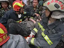 ![]() A collapsed residential block in Wenchuan being bulldozed in the aftermath of the earthquake; exposed mountain faces can be seen in the background. | |