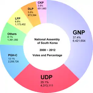 Legislative elections were held in South Korea on April 9, 2008.[1] The conservative Grand National Party won 153 of 299 seats while the main opposition United Democratic Party won 81 seats.[2] This election marked the lowest-ever voter turnout of 46.0%.[3]