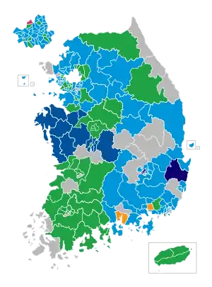 | Daejeon | 6 | 1,101,299 | 499,193 | 45.3 | Liberty Forward Party | 198,355 | 40.0 | 5 | 169,358 | ||