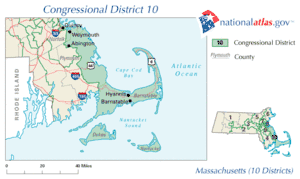 Massachusetts's 10th congressional district covers the south-east part of the state, including parts of the South Shore and all of Cape Cod and The Islands. It has been represented by Democrat Bill Delahunt since 1997. CQ Politics forecasted the race as 'Safe Democrat'.