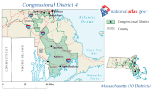 Massachusetts's 4th congressional district lies in the southern part of the state, including the South Coast region. It has been represented by Democrat Barney Frank since 1981. CQ Politics forecasted the race as 'Safe Democrat'.