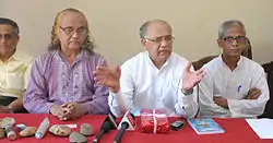 On 20 February 2011, following the publication of Saldanha's and Somasekhara's contradictory reports on the attacks on churches, more than 100,000 Christians representing some 45 Christian denominations and secular organisations gathered in Mangalore to protest.[116] Present was Bishop Aloysius Paul D'Souza of Mangalore Diocese, Bishop Emeritus C. L. Furtado and Bishop John S. Sadananda of the CSI Karnataka Southern Diocese, AICC general secretary Oscar Fernandes, Bishop Lawrence Mukkuzhy of the Catholic Syro-Malabar Diocese of Belthangady, Geevarghese Mar Divannasious of the Syro-Malankara Diocese of Puttur, Diocesan Vicar-General Msgr Denis M. Prabhu; and some 24 new-generation churches united under the Karnataka Missions Network (KMN) including the Campus Crusade for Christ (CCC), Operation Mobilization Bookstall (OMB), Good News Book Centre (GNBC), All India Catholic Union (AICU), Catholic Association of South Kanara (CASK), and International Federation of Karnataka Christian Associations (IFKCA).[117] Secular organisations participating in the protest included Udupi Jilla Alpasankhyatara Vedike (UJAV), the People's Union for Civil Liberties (PUCL), the DK District Committee, the local unit of the Democratic Youth Federation of India (DYFI), and the Muslim Vartakara Sangha (VS) and Muslim Okkoota groups.[117] The protest rally was "organised against a backdrop of an apparent whitewash by the B. K. Somasekhara Commission concerning Hindu radicals and government agencies."[116] The protesters tied black cloths over their mouths and carried black flags as they walked silently for about a kilometre in one of the strongest Christian areas of the city.[116] George Castelino, a Catholic lay leader who guided the march, stated that the black "symbolised that the action of the government and its commission have silenced Christians."[116] Rev. Alwyn Culaso of the Full Gospel Church said that "This is a sea of Christianity that is wounded by the attacks on the churches by the fundamental groups. The government should look at the faith and patience of these people and give justice."[116] On 17 February 2011, Ronald Colaco, Chairman of IFKCA and Higher Education Minister V. S. Acharya submitted a memorandum to Yeddyurappa, demanding that the cases filed against Christian youths be dropped.[118] Following the publications of the reports and subsequent protests, the government of Karnataka announced that it would drop 338 cases against Christians who had protested in the attacks.[110] In December 2011, 23 cases against Christians were dropped upon request by the Karnataka Christians International and the Mangalore Diocese.[119]