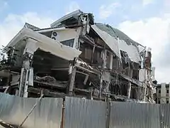 Authorities announced that several disaster management teams were en route to Padang although it took several hours for them to reach more remote areas.[22] Rescue workers pulled dozens of survivors from the rubble and rushed them to Djamil Hospital. The hospital itself was overwhelmed with patients, and many patients were treated in tents set up outside the hospital. A man was trapped beneath a flattened hotel for 25 hours with a broken leg before rescue workers pulled him free. The Indonesian military deployed emergency response teams with earth moving equipment to help move rubble and recover trapped victims.[23] Rescue workers and volunteers searched the rubble of a collapsed three-story concrete building, rescuing survivors and recovering bodies while parents of students trapped inside waited nearby.[24] Indonesian villagers used their bare hands to sift through ruins and try to find survivors.[25] On 5 October, Indonesian rescue workers called off their search for trapped survivors and increased efforts to recover bodies, clear rubble, and provide aid to survivors.[26] Indonesian authorities used helicopters to airdrop food and blankets into remote areas, and to bring the wounded from these areas to hospitals.[27]