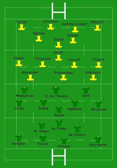 Report[20] | Tries: du Preez 19' c de Villiers 51' c Con: M. Steyn (2/2) Pen: F. Steyn (3/3) 6', 9', 26' M. Steyn (2/2) 33', 71' Drop: M. Steyn (1/1) 17' |