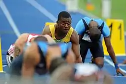 After hurting his groin during his American record run in the 100 metres two days earlier, Gay withdrew from the race, effectively rescinding his second world title. The withdrawal of Dwain Chambers, Churandy Martina and Jaysuma Saidy Ndure also reduced the quality of the field. There were no surprise eliminations in the heats, where Crawford, Mullings, Robert Hering, and Martial Mbandjock were the fastest qualifiers,[2] and Mullings had the fastest time of the quarter-finals round, with all the favourite athletes progressing.[3] On the second day of competition, German number one Hering was eliminated. Bolt and Spearmon were the two semi-final winners, while the third-fastest, 19-year-old Alonso Edward, demonstrated medal winning form.[4]