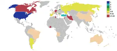 The four wild cards were determined by FIBA through criteria. For example, a team must have played in the Zone's qualification tournament to receive recommendation.[10] Also, in order for every team to have an opportunity for a wild card, a maximum of three teams from any Zone can be allotted a wild card entry. Once these requirements are satisfied, FIBA then looks at other important factors. Those include popularity of basketball within the country, success of the team, and government support for the team's National Federation. As of 2009, FIBA now requires that wild card candidates pay a late registration fee to be considered.[11]
