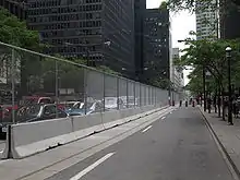The ISU created a security perimeter, beginning with the outer boundary, specifically bordered by King Street to the north, Lake Shore Boulevard to the south, Yonge Street to the east, and Spadina Avenue to the west, where vehicles would be restricted during the summit dates.[17] Residents who lived within the security zone were issued registration cards prior to the summit and other pedestrians who wished to enter the security zone were only able to do so at one of 38 checkpoints, where they were required to present two pieces of photo identification and provide justification for entry.[21] The area surrounding the Metro Toronto Convention Centre itself was fenced and off-limits to civilians and protesters.[22] The 3-metre (10 ft) high fence, contracted to SNC-Lavalin by Public Works and Government Services Canada and installed by two Gormley, Ontario-based companies,[23] was built at a cost of $5.5-million and installation began on June 7.[24] The Toronto Police Service installed 77 additional closed-circuit television security cameras in the area and purchased four Long Range Acoustic Devices which were to be in use exclusively during the summit.[25] The ISU decided on also using water cannons for riot control.[26] The security perimeter even extended into the waters of Lake Ontario and included a Maritime Security Operation with numerous Police vessels and the Canadian Coast Guard Ship Griffon patrolling to discourage international demonstrators from unlawful entry into Canada.
