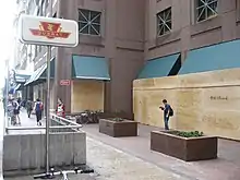 A former film studio located on Eastern Avenue was designated as a temporary detention centre for individuals arrested during the summit.[27] Toronto Police Service announced that Trinity Bellwoods Park would be the designated protest area, but following opposition from local residents, police relocated the designated protest zone to the northern part of Queen's Park.[28] Canada Post declared that it would remove post boxes in the security zone.[29] Toronto Parking Authority removed some parking meters as well. Small trees along sidewalks around the convention centre were removed to prevent them from being used as weapons by protesters.[30][31] Other removed municipal properties include 745 newspaper boxes, 200 public trash cans, 70 mailboxes, 29 bus shelters, and 5 public information boards.[32]